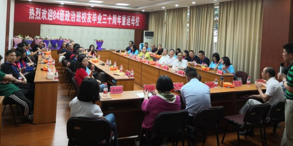 随后,84级政治班班主任罗晓芹老师重温点名仪式,同学们好像又回到30年前青春年少的好时光。任课教师代表杨明亨老师做了充满激情的发言,祝贺同学们在各自工作岗位上取得的成绩,也希望同学们常回家看看,为母校多出主意、多提建议。校友代表沙玛阿果和邓艳以及在校学生代表周海媚同学也在会上做了发言。
