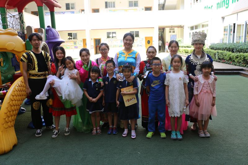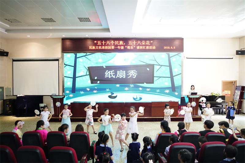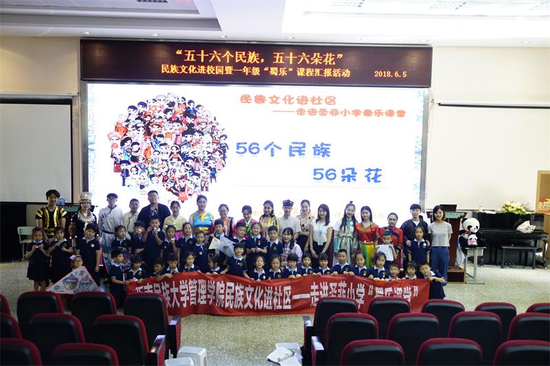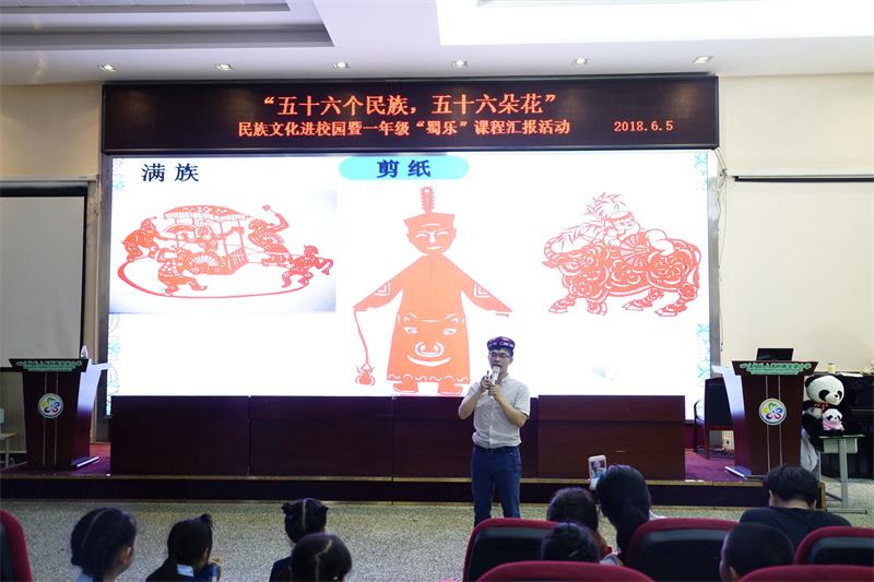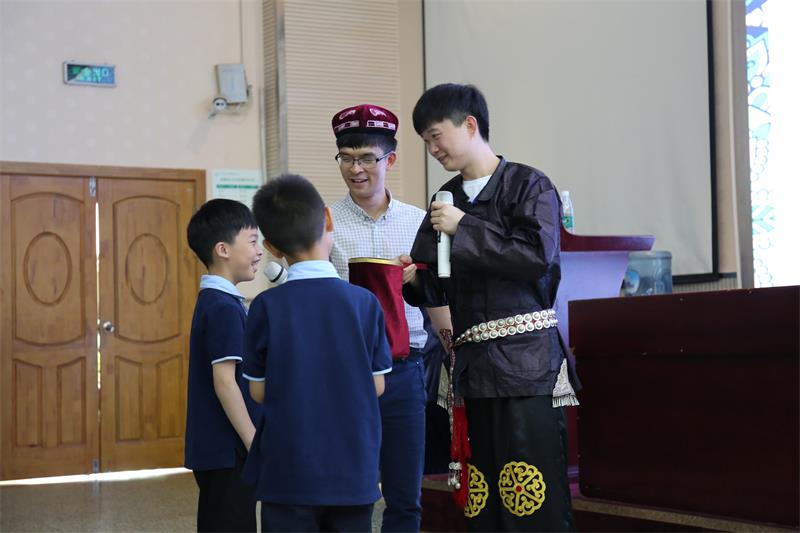 徐伟老师以通俗易懂的语言、活泼有趣的讲解、丰富生动的图片结合圣菲小学“蜀乐”课程为一年级的小朋友讲解了在四川较有特色的藏、彝、羌、回、苗及在全国较有特色的蒙古、维吾尔、满、朝鲜、壮10个民族的服饰、饮食、节日等内容。在课程中,参与表演的16名同学以舞蹈、服饰表演、武术、魔术等形式展示了各民族的文化特点,也向在场的小朋友们传递了“和合偕习、自信自强”的民大精神。在场的一年级各班也结合“蜀乐”课程,为大家表演了以纸为主题的诗朗诵、贴冷裱膜、折纸、纸扇秀、风筝秀等节目。