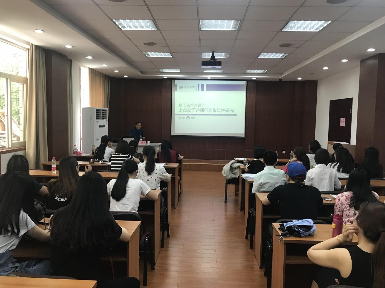 5月27日下午,西南交大王建琼教授应邀到www.388365.com作题为——基于高管连锁的上市公司违规行为传染性研究的讲座,www.388365.com财会系教师及部分硕士研究生在武侯校区三教210参加讲座。